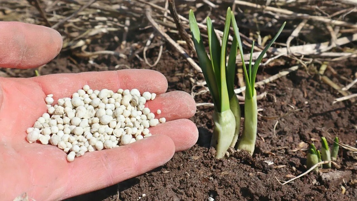 Готовая химия. Хорошо подходит аммиачная селитра вместе с суперфосфатом. Можно взять и комплексное удобрение с маркировкой «для луковичных» или «весеннее» — в нем обычно сбалансирован состав.
