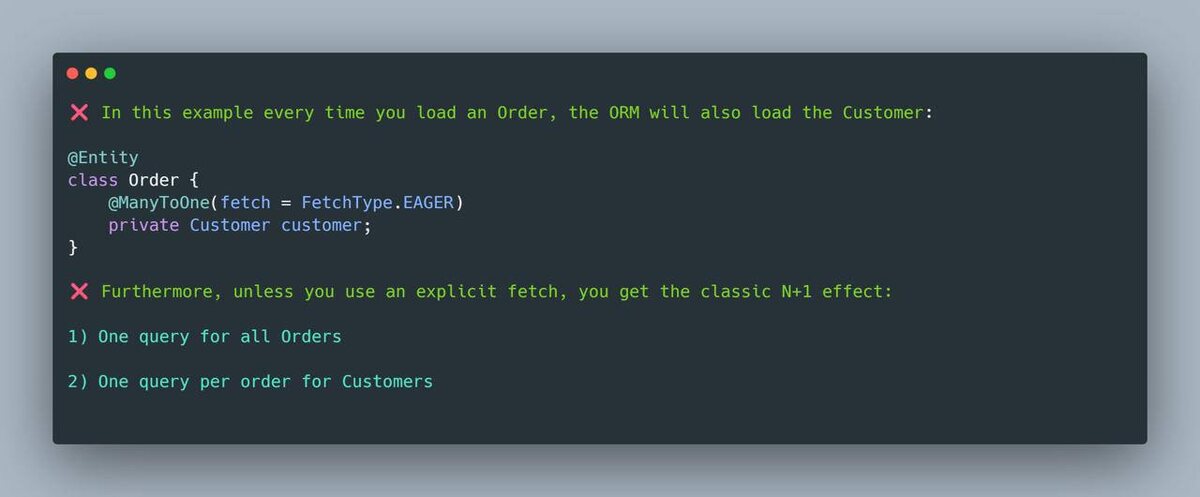 Кажется удобным, но на практике это ловушка. Когда ты ставишь EAGER, ORM начинает загружать связи всегда, даже если они тебе вообще не нужны. Что происходит под капотом: ❌ Загружается лишнее ❌ Растёт нагрузка на БД ❌ Ухудшается производительность И самое неприятное 👇 Ты получаешь классический N+1 problem: - 1 запрос на все Orders - + N запросов на связанные Customers И это может убить приложение на проде. 👉 Правильный подход: - по умолчанию используй LAZY - загружай связи явно (fetch join / entity graph) - контролируй, что и когда тянется из БД EAGER - это не удобство. Это скрытый источник проблем.
