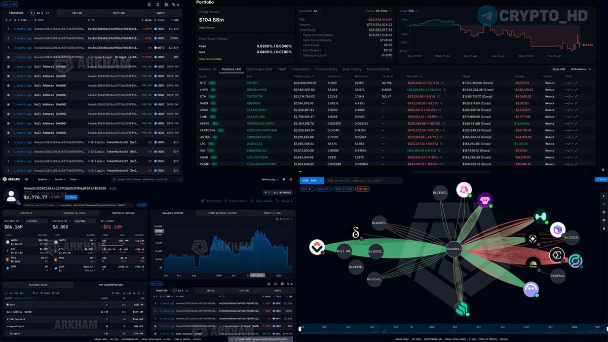 … Раньше он просто держал почти $90m в #ETH. Но этого оказалось мало – весь капитал ушел на Hyperliquid, где трейдер открыл кучу лонгов более чем на $132m. Сейчас картина такая: ✦ Просадка уже около $24m. ✦ На аккаунте осталось примерно $24m. ✦ Позиции все еще живы. Список активов, по которым открыты сделки: #BTC, #HYPE, #ETH, #PAXG, #AVAX, #LINK, #PEPE, #ASTER, #FARTCOIN, #LTC, #SUI, #NEAR, #BONK, #PUMP, #ZEC, #ZRO, #MNT, #ENA, #VVV, #CFX, #ICP, #WLD, #XMR, #WIF, #XPL, #LINEA, #HBAR, #TON, #ATOM, #ENS, #LIT, #ADA, #APEX, #JUP, #TAO, #POPCAT, #DOGE, #STRK, #ZK, #RESOLV. Crypto Headlines