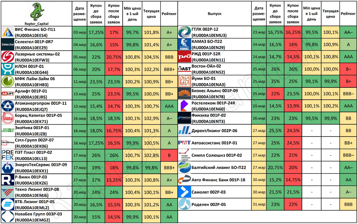 📌 На рынке облигаций появляется всё больше новых выпусков, поэтому решил собрать статистику по недавним размещениям и выявить некоторые закономерности. • В большинстве случаев при сборе заявок эмитенты снижают ставку купона или увеличивают объём размещения, иногда совмещают оба действия. Чем выше спрос на участие, тем сильнее компания может снизить купон, чтобы занять деньги на более выгодных условиях. • Собрал в таблицу данные по всем выпускам облигаций с размещением в марте, нашёл 31 выпуск, 7 из которых ещё не разместились. Взял облигации только с фиксированным купоном, не брал СФО и облигации от банков. • Выводы по снижению купонов: 1) В 22 из 31 выпусков эмитенты снижали ставку купона. Если не учитывать режим Z0, то купоны снизили в 22 случае из 25 (Z0 – прямое размещение, параметры выпуска определены заранее и не меняются, а заявки подаются и исполняются внутри одного дня). 2) Среднее снижение купона составило –0,81%. При этом снижения на 1% или больше были в 11 случаях, ровно в