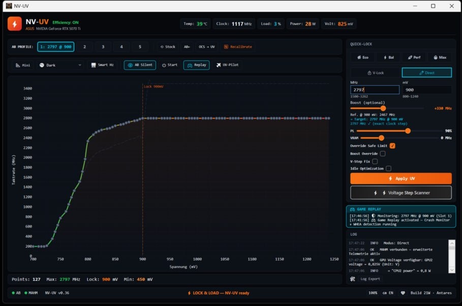 Программа используется вместе с MSI Afterburner и позволяет буквально в несколько кликов снизить нагрев и потребление видеокарт RTX 5000-й серии при сохранении производительности. По крайней мере задумка именно такая. Также снижается уровень шума. Поддерживается такая фича как переключение профилей на лету, чтобы не слышать видеокарту при офисной работе или браузинге, но получать полную производительность на лету. Причем, предполагаются профили под конкретные игры. Андервольтнг, выполненный с ошибками, может привести к временной нестабильности видеокарты, поэтому найти правильные настройки это всегда искусство. Совместимость NV-UV пока заявляется лишь для RTX 5070, RTX 5070 Ti, RTX 5080 и RTX 5090. Поддержка RTX 5060 в ближайших планах, как и поддержка видеокарт для ноутбуков. Прочие карты на данный момент не поддерживаются.