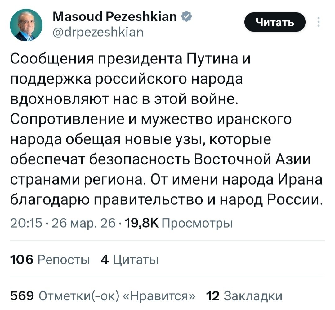 Президент Ирана Пезешкиан на русском языке поблагодарил Путина и народ России за поддержку.