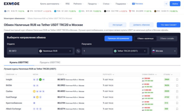 - Используйте только проверенные криптообменники в Москве на наличные из актуального рейтинга (EastChange, BitOkk, Insight, KriptoObmennik) или мониторинга Exnode.