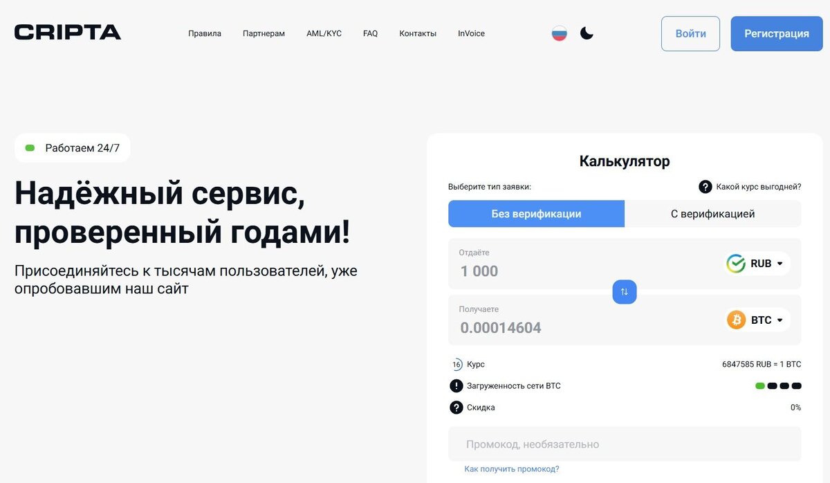 Конкретного процента комиссии сервис не указывает. Я проверял: разница между рыночным курсом BTC и тем, что предлагает крипто сс, может доходить до 10–18% на некоторых парах. Это много. На других направлениях — скромнее, процентов 5–7. Так что перед обменом сравнивай курс на Крипта CC с тем, что дают конкуренты на BestChange. Не ленись — речь про твои деньги.