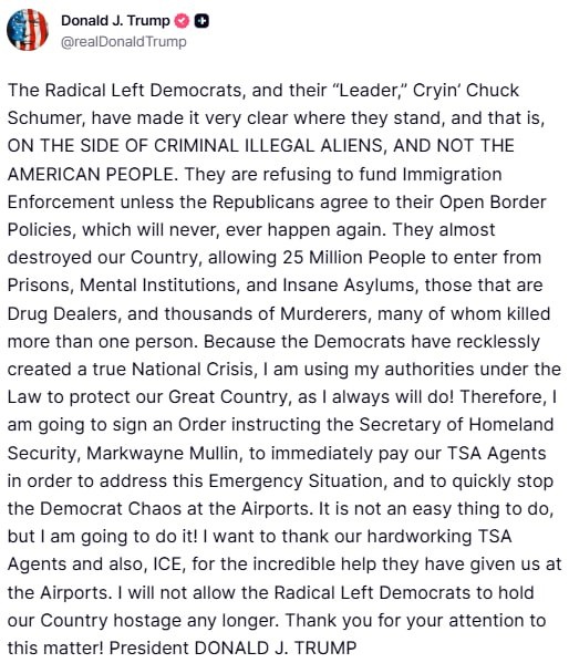 Trump ordering new DHS Sec. to 'IMMEDIATELY PAY our TSA Agents'