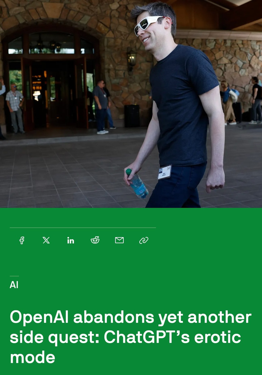 OpenAI официально отказалась от внедрения эротических функций в ChatGPT. Компания прекратила разработку и поддержку подобных возможностей в чат-боте. https://dzen.ru/id/5c0e38ff46ef5c00aaa80527