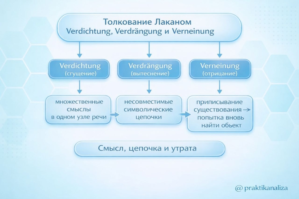 Когда человек говорит, он редко контролирует весь смысл целиком. По Лакану, слово работает как структура: одно означающее может тянуть за собой сразу несколько линий смысла, и именно поэтому в разговоре часто возникает двусмысленность, оговорка, странное чувство, что сказанное значит больше, чем было задумано. 1. Сгущение Одно слово собирает несколько смысловых цепочек. В клинической практике это видно в шутках, оговорках и повторяющихся формулировках: человек думает, что выбирает нейтральное выражение, а в нём уже спрятан конфликт. Фрейд в работе Толкование сновидений называл это сгущением: психика уплотняет смысл, чтобы он прошёл в речь без прямого признания. 2. Вытеснение Иногда две смысловые линии не удерживаются вместе, потому что одна требует признания, а другая — сохранения привычной картины себя. Тогда один ряд уходит из речи, но не исчезает. Он возвращается через симптомы, импульсивные реакции, забывания и повторяющиеся сценарии. В бытовой жизни это выглядит так: человек уве