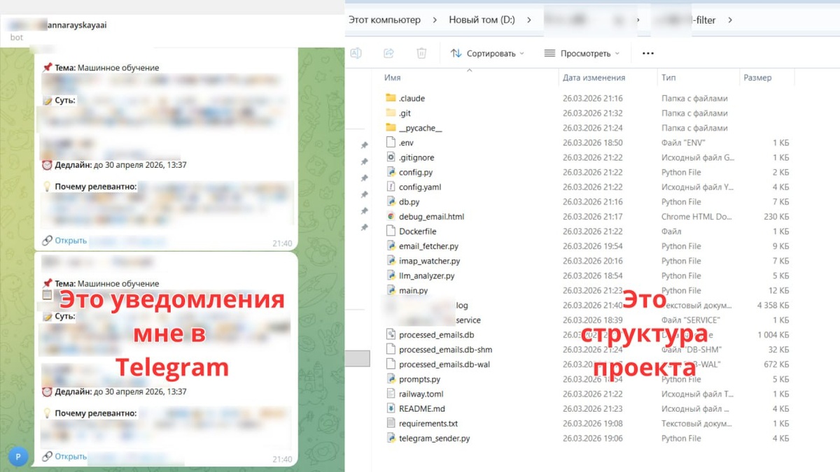 Я подписана на реально полезную и важную для меня рассылку, на которую при этом приходят десятки писем в день. Из них реально полезных около 2-3 в день, а остальное — информационный шум. Раньше я вручную открывала каждое письмо, сканировала глазами и решала, надо мне это или нет. Сегодня я это полностью автоматизировала с помощью искусственного интеллекта. Что я сделала: 1) Написала техническое задание ИИ-агенту 2) Передала его на реализацию другому ИИ-агенту 3) Тот написал весь код 4) Я опубликовала проект в облаке, чтобы он работал без меня и полностью автономно Как работает система: Скрипт подключён к моей почте и слушает её в реальном времени. Когда приходит новое письмо от рассылки, он выгружает ее содержимое и вытаскивает из него ключевую для меня информацию. Сначала срабатывает быстрый фильтр по ключевым словам, который отсеивает ~90% мусора без вызова ИИ (это помогает мне экономить токены). Оставшиеся запросы отправляются в Claude API, который оценивает: это мне нужн
