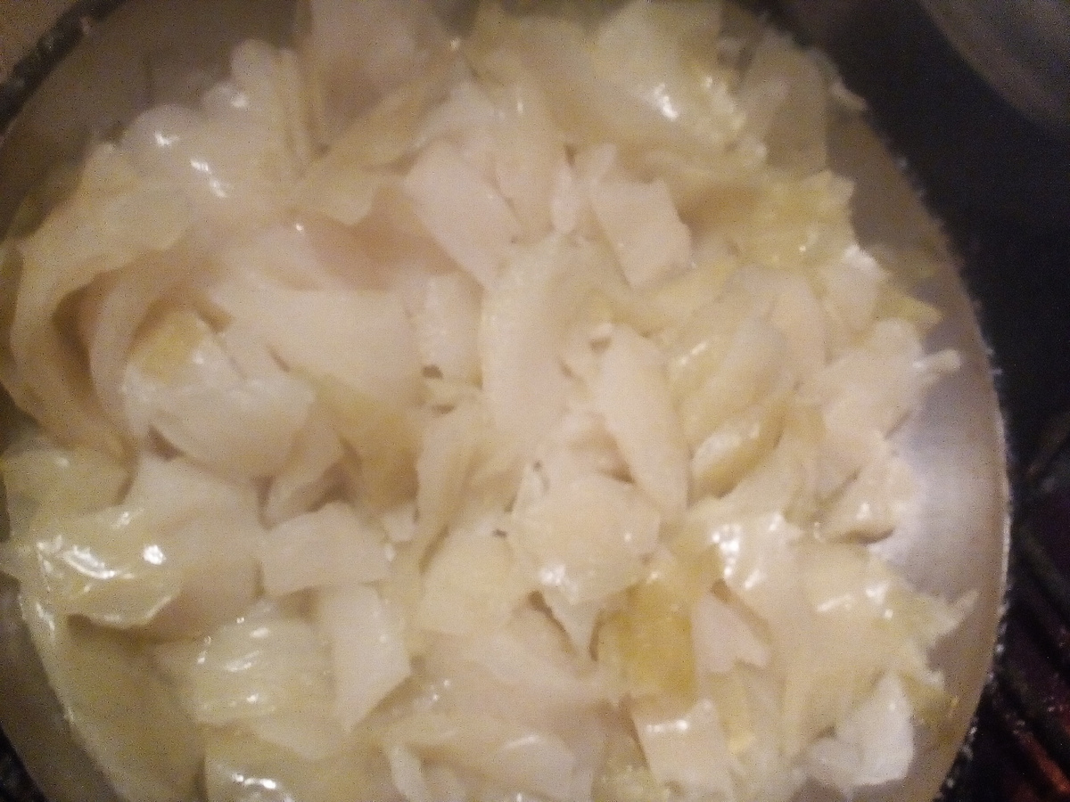 Зайду издалека: Омлет можно делать "пустой", а можно с наполнителем. В моём детстве мама делала омлет с кусочками вареной колбасы. Нормально, но я не фанатею от такого, сам никогда не делал. Я люблю заливать яйцами - варёную капусту. И вот... Яиц нет (вчера последние два съел, а сегодня поленился магазинить)... А когда последний раз делал капусту и уточнил в интернете, сколько варить, то интернет в частности сообщил, что если варите для последующего тушения, то 20 минут. "Ага", - подумалсь мне. Однако, сунувшись в интернет в поисках рецепт, такового не нашел. Пришлось действовать по интуиции.... 1. По факту капуста сегодня - самый дешевый продукт. 30 рублей за кг. 2. Я не люблю ее шинковать. Картошку в сыром виде я тоже не люблю чистить, кстати... 3. Большие куски капусты - в воду и варю минут 20. 4. Выкладываю на сковородку. Ножиком прямо в сковородке режу кусок на куски поменьше. 5. Солю, поливаю подсолнечным маслом, ставлю на огонь. 6. Тушу до готовности. За 5 ми