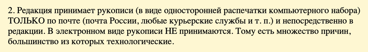 Редакция принимает рукописи (в виде односторонней распечатки компьютерного набора) ТОЛЬКО по почте (почта России, любые курьерские службы и т. п.) и непосредственно в редакции.