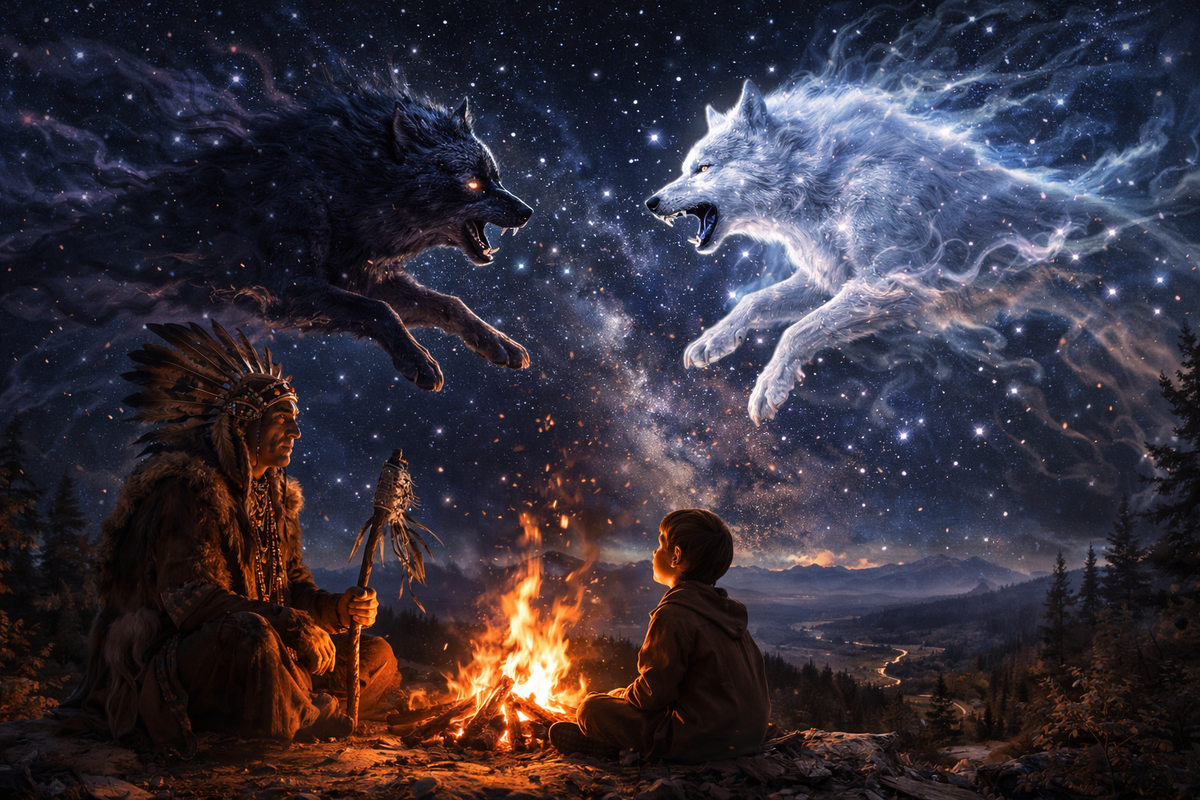 Притча о двух волках живет веками не потому, что она красиво звучит, а потому, что она попадает в самую болезненную и самую точную точку человеческой жизни. Мы действительно состоим из внутренней борьбы. Мы действительно становимся тем, что подпитываем. Мы действительно каждый день выбираем, что будет жить в нас сильнее — хаос или порядок, обида или достоинство, самолюбие или любовь, саморазрушение или вера.