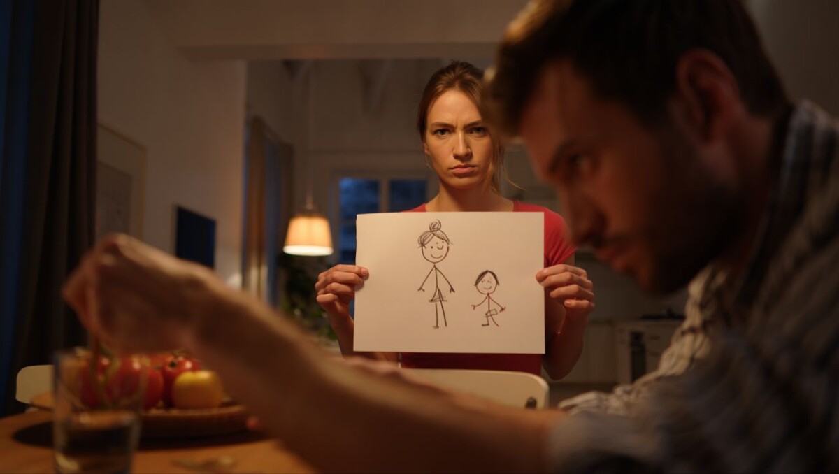 Под подушкой, как и говорила Людмила, белел край бумаги. Андрей осторожно вытащил рисунок и поднёс к свету ночника. Два человечка, большой и маленький. Мама и дочка. Над ними — солнце, рядом — дом. Всё, что нужно для счастья. И никакого третьего.