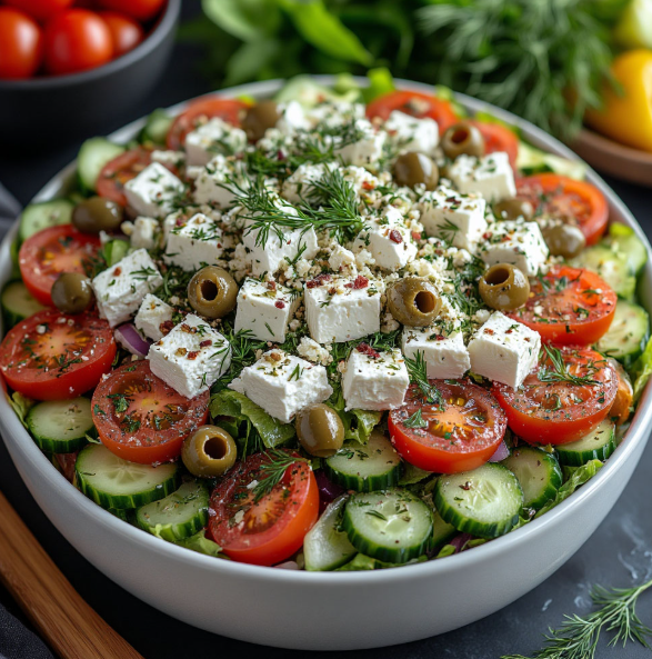 Этот салат — идеальный вариант для сытного, но не тяжелого обеда, когда хочется свежести и ярких вкусов. Он готовится за 15 минут из доступных продуктов, богат клетчаткой, полезными жирами и белком. Классическое сочетание овощей, сыра и оливкового масла подарит ощущение солнечной Греции даже в будний день.