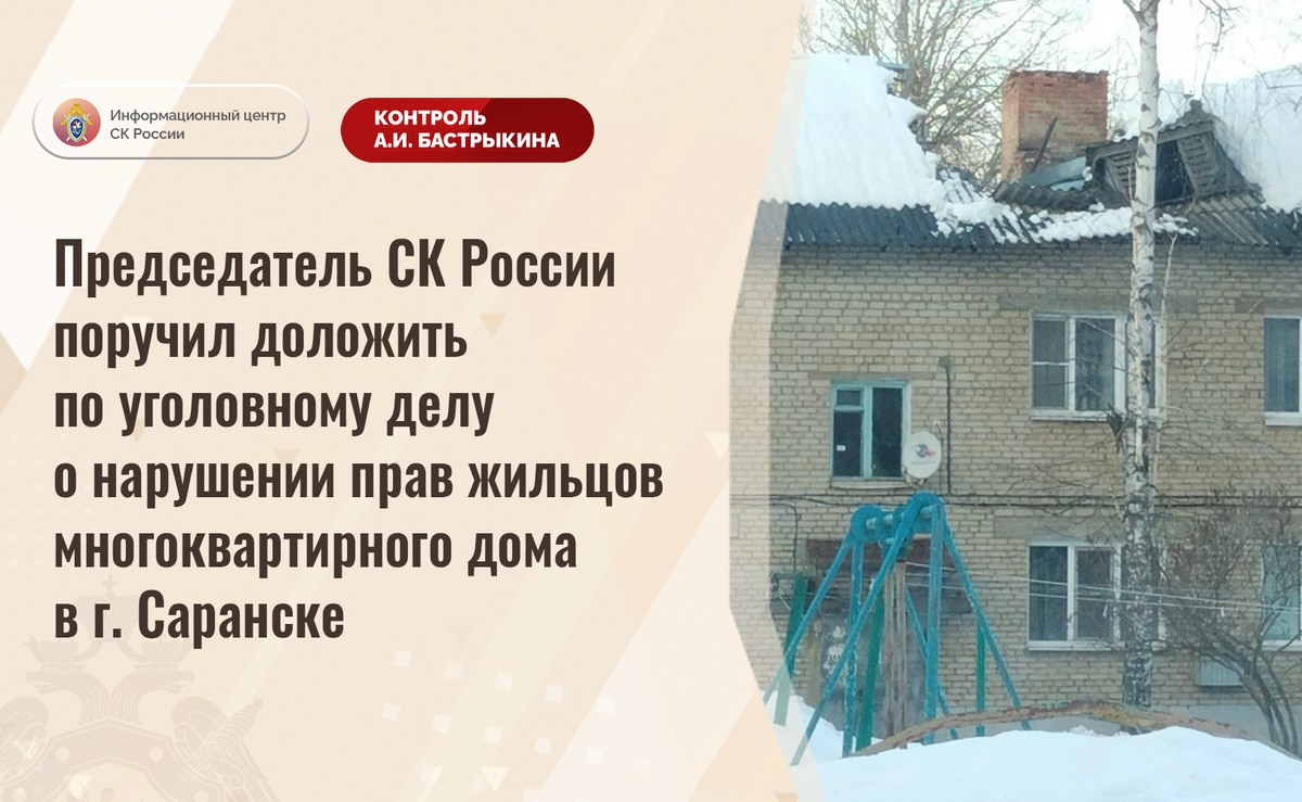 Председатель СК России поручил доложить по уголовному делу о нарушении прав жильцов многоквартирного дома в г. Саранске В комментариях социальной сети СК России поступило обращение о ненадлежащем обслуживании многоквартирного дома 1964 года постройки на улице Котовского в городе Саранске. Из-за длительного бездействия по расчистке кровли двухэтажного здания от снега и наледи в марте текущего года произошло частичное обрушение перекрытий. При этом аварийно-восстановительные работы своевременно не организованы, ввиду чего жилые помещения затапливаются. В СУ СК России по Республике Мордовии расследуется уголовное дело. Председатель Следственного комитета Российской Федерации Александр Иванович Бастрыкин поручил руководителю СУ СК России по Республике Мордовии Олегу Алексеевичу Коробову доложить о предварительных и окончательных результатах расследования уголовного дела. Исполнение поручения поставлено на контроль в центральном аппарате ведомства. #СледственныйКомитет #СКРоссии #СК #ИЦСКР