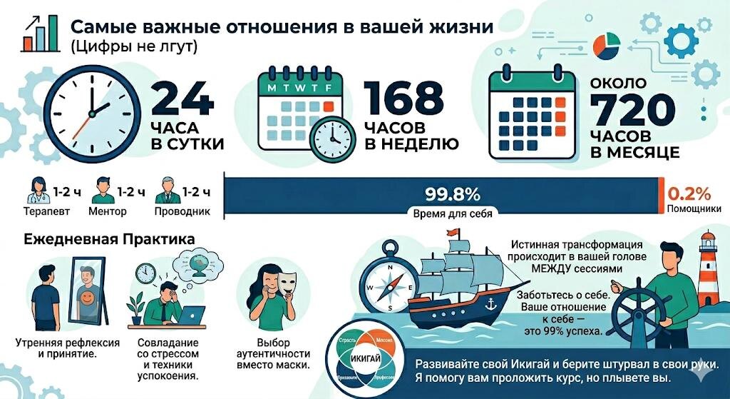 Ты когда-нибудь задумывался, сколько времени проводишь с собой, а сколько с «помощниками»? Давай трезво посчитаем: 24 часа в сутки. 168 часов в неделю. Около 720 часов в месяц. А теперь взгляни на свой календарь. Сессия с терапевтом, работа с ментором или встреча с наставником — это обычно 1 или 2 часа в месяц. Это всего лишь 0,2% твоего времени. Остальные 99,8% времени ты остаешься наедине со своими мыслями, привычками и решениями. Ты правда веришь, что эти два часа «магии» у мастера сделают за тебя всю работу? Мастер — не волшебник. Он — Навигатор/Компас.