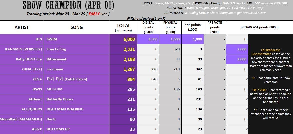 🍊 По предварительным прогнозам, "Swim" занимает 1-е место по всем показателям на Show Champion, Music Bank и Music Core.
