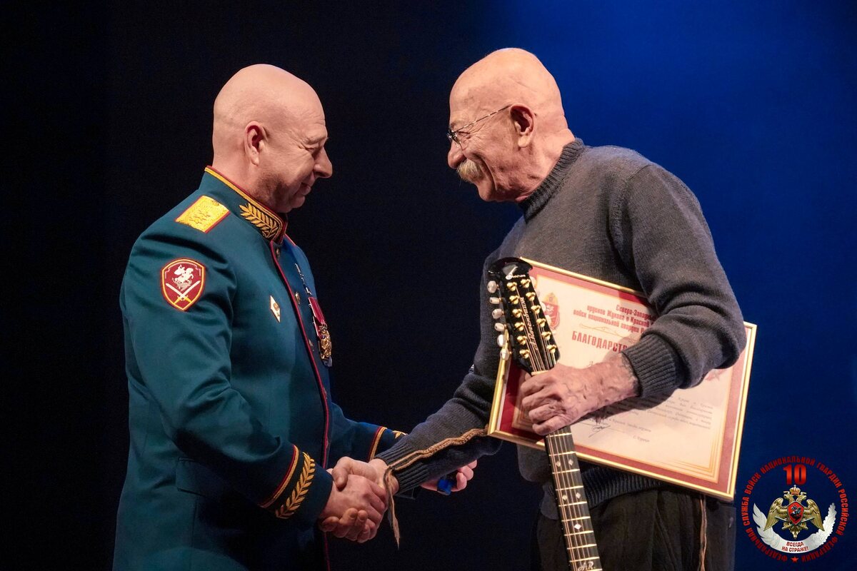 праздничный концерт Командующий Северо-Западным округом Росгвардии Герой России генерал-полковник Сергей Бураков поздравил личный состав воинских частей округа, Главного управления по Санкт-Петербургу и Ленинградской области, подразделений ОМОН и СОБР, вневедомственной охраны, лицензионно-разрешительной работы и госконтроля, курсантов Военной академии Росгвардии, ветеранов и членов семей росгвардейцев. Собравшиеся почтили память боевых товарищей, погибших при исполнении воинского и служебного долга. Со сцены дворца культуры "Выборгский" росгвардейцев поздравили народные артисты Российской Федерации Александр Розенбаум и Василий Герелло, заслуженный артист Санкт-Петербурга Виталий Аксёнов, народная и эстрадная певица Алена Петровская, казачий ансамбль "Атаман", ансамбль танца "Кувырок", военный оркестр штаба и ансамбль песни и пляски Северо-Западного округа Росгвардии.