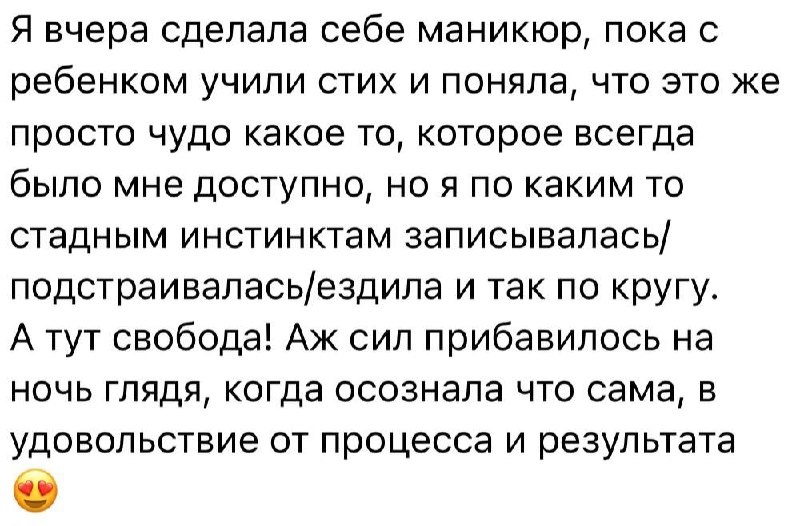 Деньги и время, понятно, у всех на слуху, а в ваших комментариях к посту выше вылезло другое, и оно мне гораздо интереснее, потому что там уже не про цифры. Когда начинаешь делать маникюр сама, появляется неожиданный бонус: сначала кайф от процесса, потом кайф от результата, и это становится спокойной частью жизни, которая реально разгружает голову. И еще появляются простые, супер базовые плюшки.Нужно подправить - подправила. Хочется сменить цвет - сменила. Сегодня не хочется ничего - оставила без покрытия. Маникюр перестаёт быть задачей, которую надо впихнуть в планы, когда они внезапно появились, и перестаёт управлять твоим календарём, да и жизнью в целом Мне очень приятно, что вокруг домашнего маникюра и пилочной техники собирается всё больше единомышленников. Очень здорово, что вы делитесь своими результатами и эмоциями. Это очень ценно, спасибо вам за это. Я со своей стороны продолжаю делиться тем, что знаю, и на курсе, и здесь 🫶