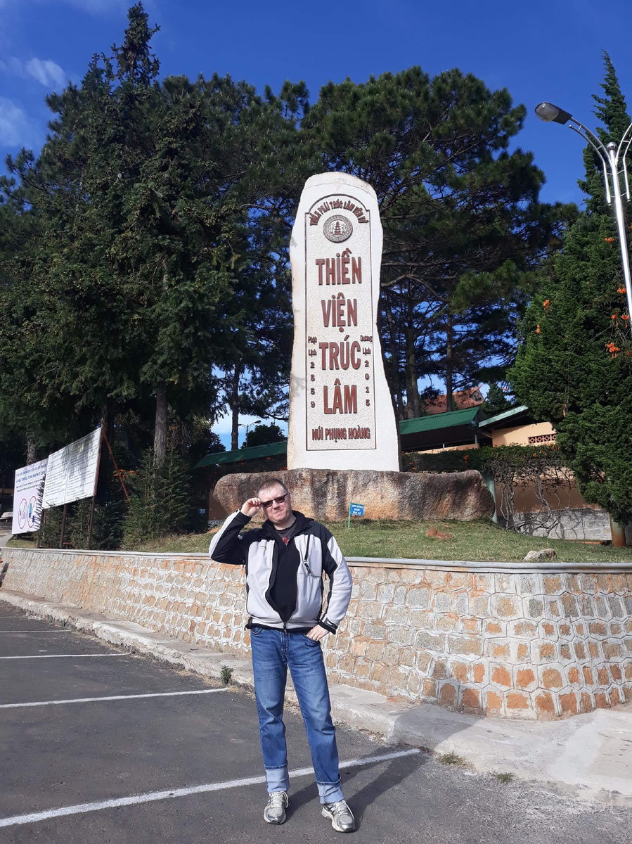Канатная дорога или по вьетнамски каптрео (так короче) спускала нас по противоположному склону холма к буддийскому храму, пагоде. Буквально дорогу перейти и стела.