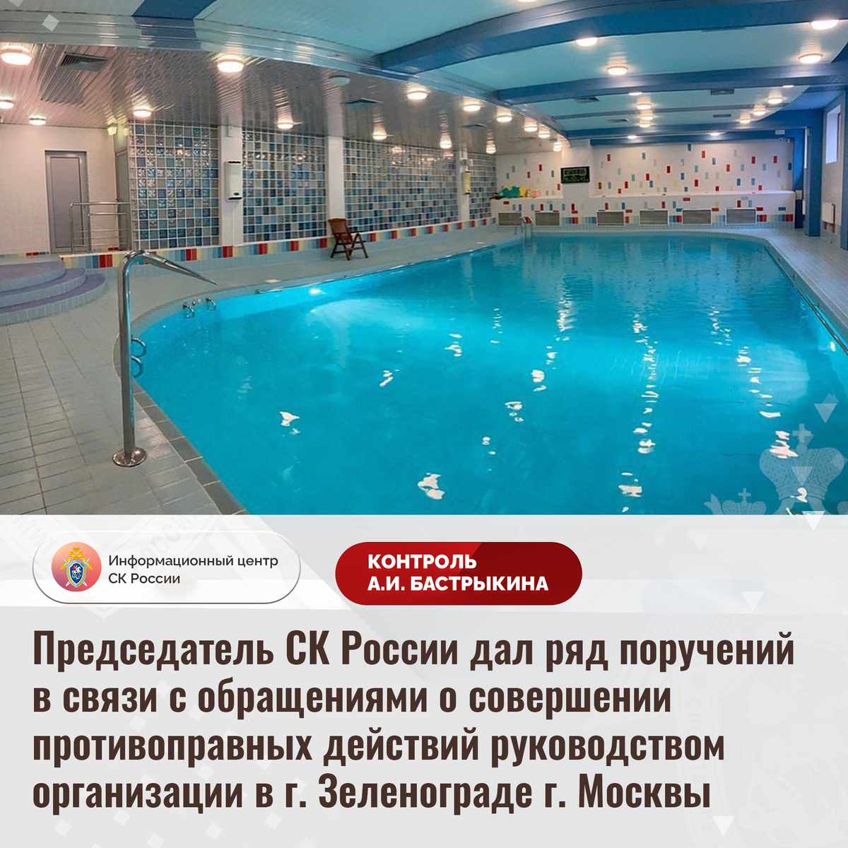 Председатель СК России дал ряд поручений в связи с обращениями о совершении противоправных действий руководством организации в г. Зеленограде г. Москвы В комментариях в аккаунте Информационного центра СК России в социальной сети «ВКонтакте» размещены обращения по вопросу совершения противоправных действий руководством центра грудничкового плавания в городе Зеленограде города Москвы. С апреля прошлого года граждане приобрели для своих детей абонементы для посещения бассейна. Однако в январе текущего года в связи со сменой собственников учреждения соглашения аннулированы, денежные средства клиентам не возвращены. Обращения граждан в различные инстанции результатов не принесли. Отмечается, что бывшим руководством центра также не выплачена заработная плата тренерскому составу. В ГСУ СК России по городу Москве возбуждено уголовное дело по ст. 145.1 УК РФ (невыплата заработной платы). Кроме того, следственными органами СК России перед прокурором инициирован вопрос о передаче материала проце