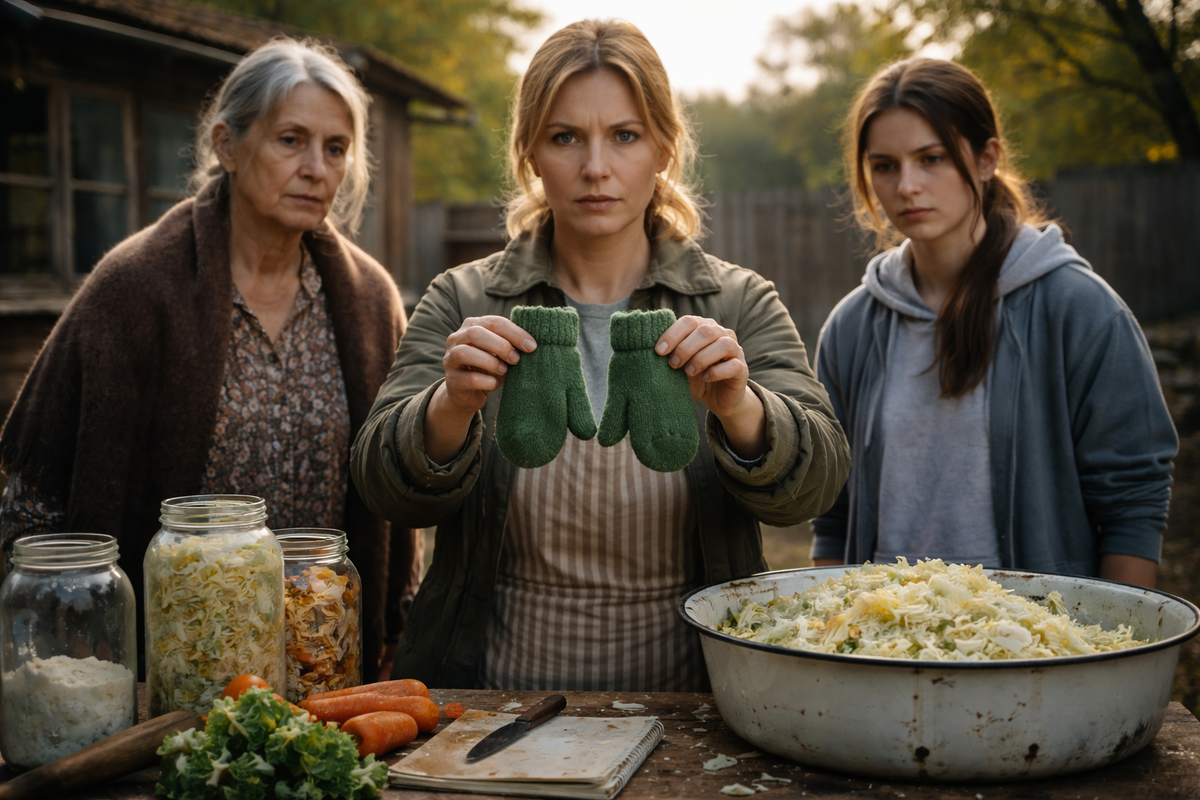 В кармане серой куртки, брошенной у сеней, Алёна нащупала маленькую зелёную варежку. Во дворе уже ставили эмалированный таз для капустницы, и от мокрых листьев пахло так густо, что ей на миг стало трудно глотать.