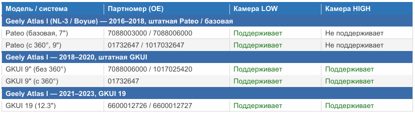 Перед покупкой камеры важно точно знать модель головного устройства. На Geely Atlas установлено несколько поколений мультимедийных систем. Штатная камера подключается к штатному разъёму жгута проводов — никаких дополнительных адаптеров не требуется.
