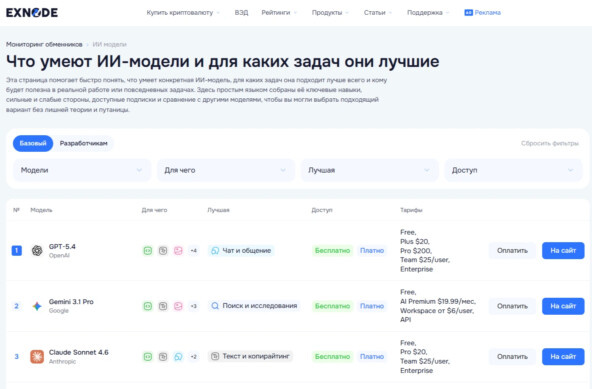 Чтобы оставаться эффективным и выбирать лучшие инструменты, важно следить за развитием рынка. В этом помогает мониторинг ИИ-моделей, например Exnode, где можно сравнивать решения по качеству, скорости и стоимости.