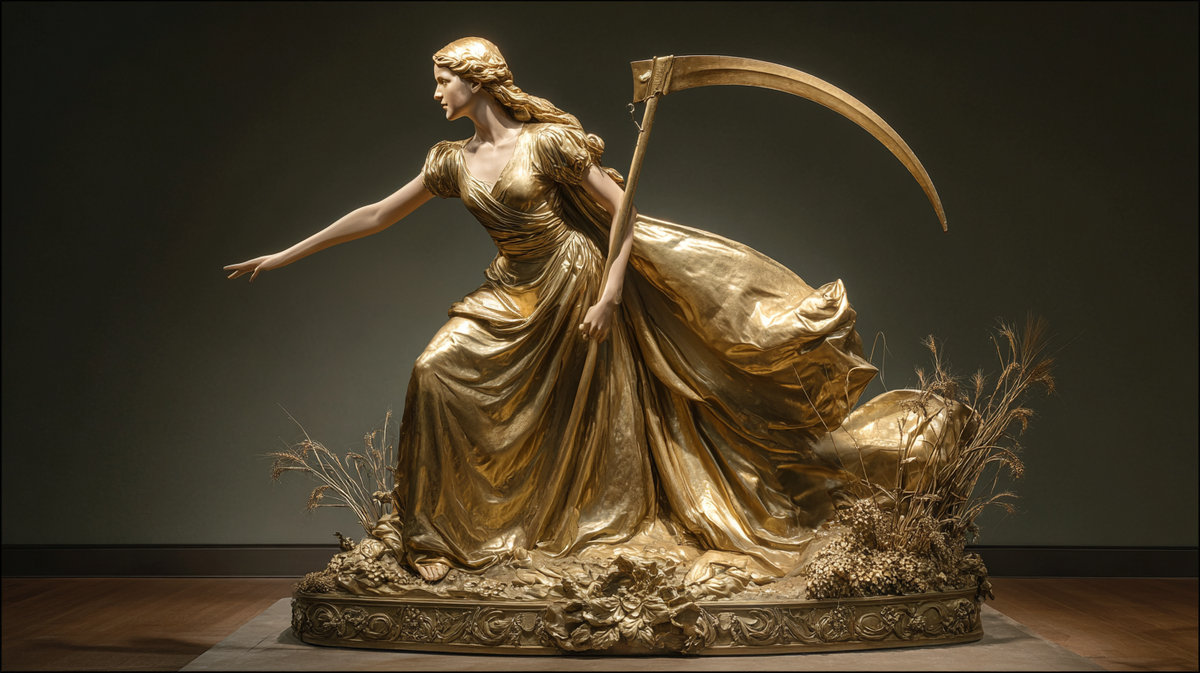 В своем золотом облачении, в образе Золотой Девочки, она сияет как воплощение процветания, успеха и денежной возможности. Ее коса отсекает бедность и долги, а ее плащ раскрывается, осыпая своих детей изобилием.