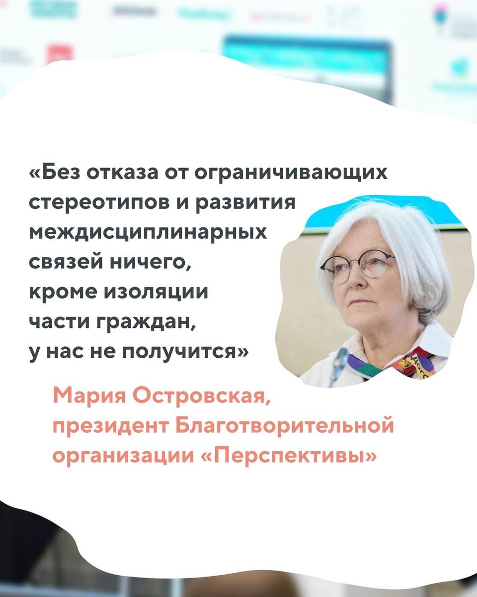 Мария Островская, президент Благотворительной организации «Перспективы», комментирует её итоги: «Конференция проходила в шестой раз, и было очевидным нарастание интереса к теме заботы о людях с особыми потребностями, их места в социальной среде. Это выразилось не только в очередном увеличении числа участников и слушателей. Но и в том, насколько яркими были выступления и бурными — обсуждения. В этот раз в центре внимания была семья человека с ментальными особенностями. Однако оказалось, что невозможно рассматривать проблемы семьи в отрыве от более широкого контекста. Пришлось затронуть вопросы образования, лечения, жизнеустройства, включения в культурное пространство. Ярким событием стало знакомство участников с выставкой про ПНИ в Музее Москвы. А также дискуссия, посвящённая теме изоляции и условий расчеловечивания особых людей, игнорирования их ценности для общества. Чтобы раскрыть тайны мира, неизвестного большинству граждан, потребовалась невероятная смелость и креативность созда