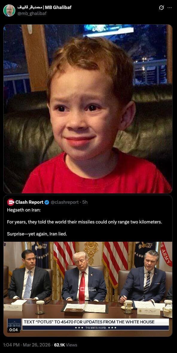Иранский спикер Мохаммад Багер Галибаф начал отвечать на заявления руководства США в мемной форме. 🤍