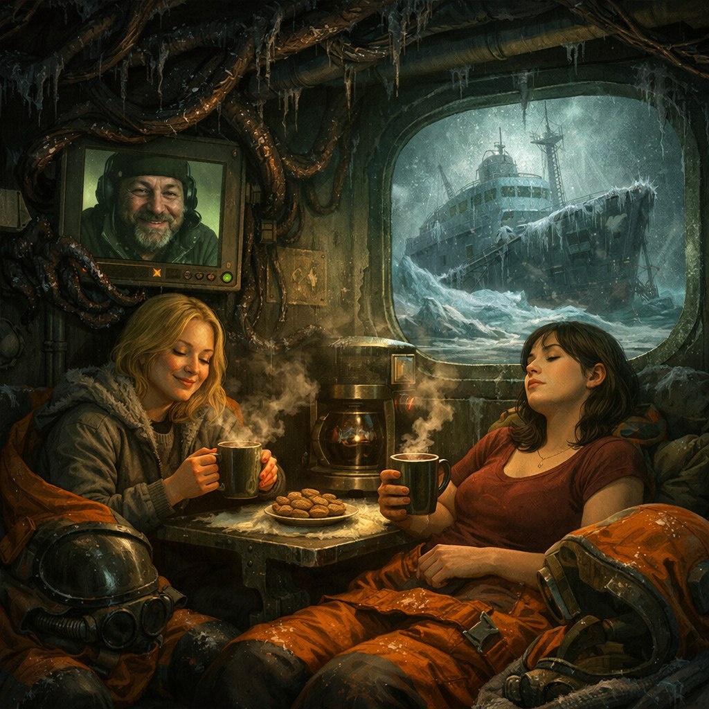 Девушки опустились в глубокие, мягкие кресла кают-компании. Искусственный интеллект продолжал плести свою невидимую словесную паутину. Он рассказывал забавные истории из жизни экипажа, описывал бескрайнее звездное небо над Арктикой. Его голос баюкал, уводил мысли прочь от пустых, обледенелых коридоров и жуткой тишины брошенного судна.