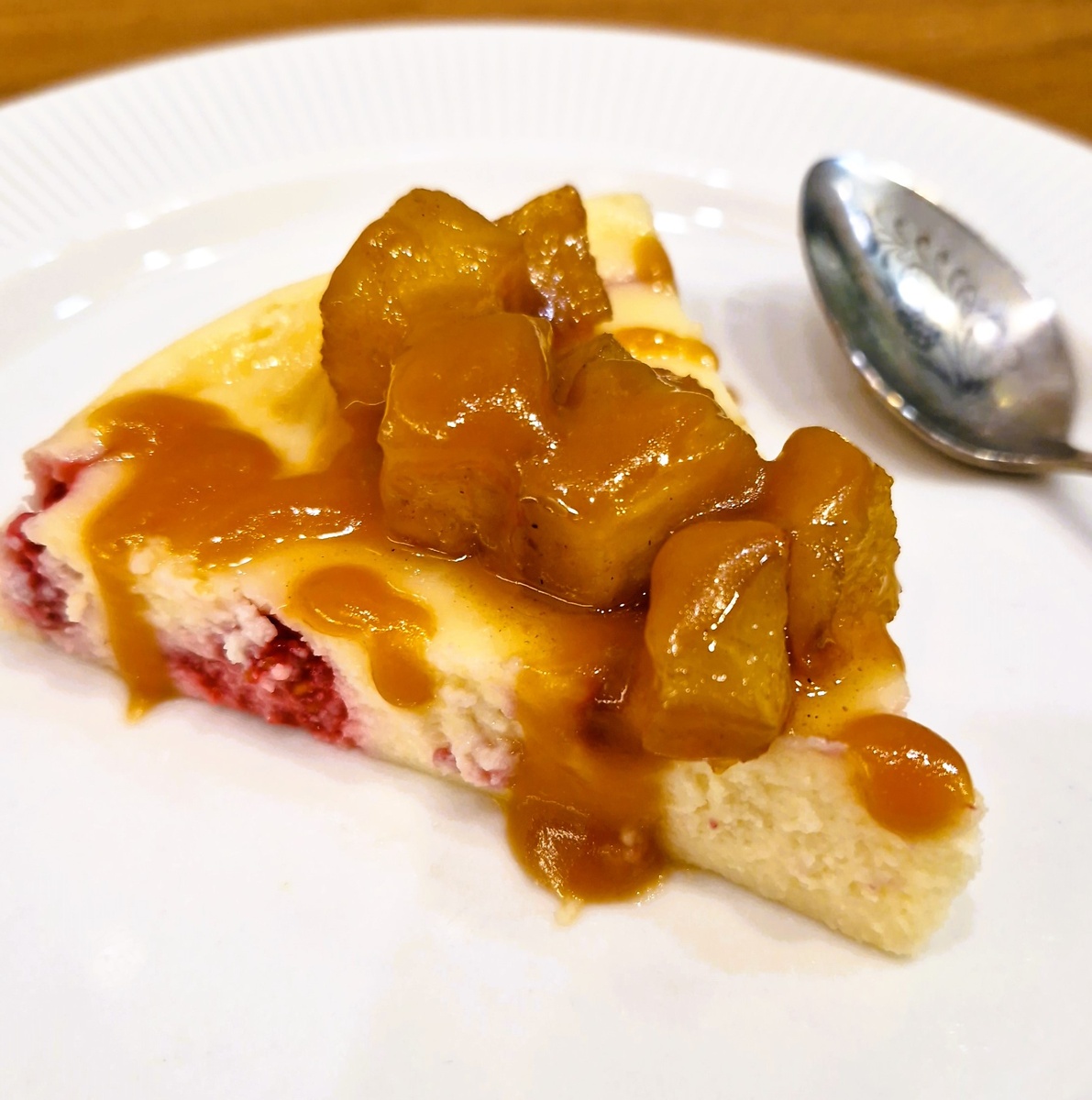 - Подаем чизкейк, выложив сверху яблоки и поливая все карамелью.