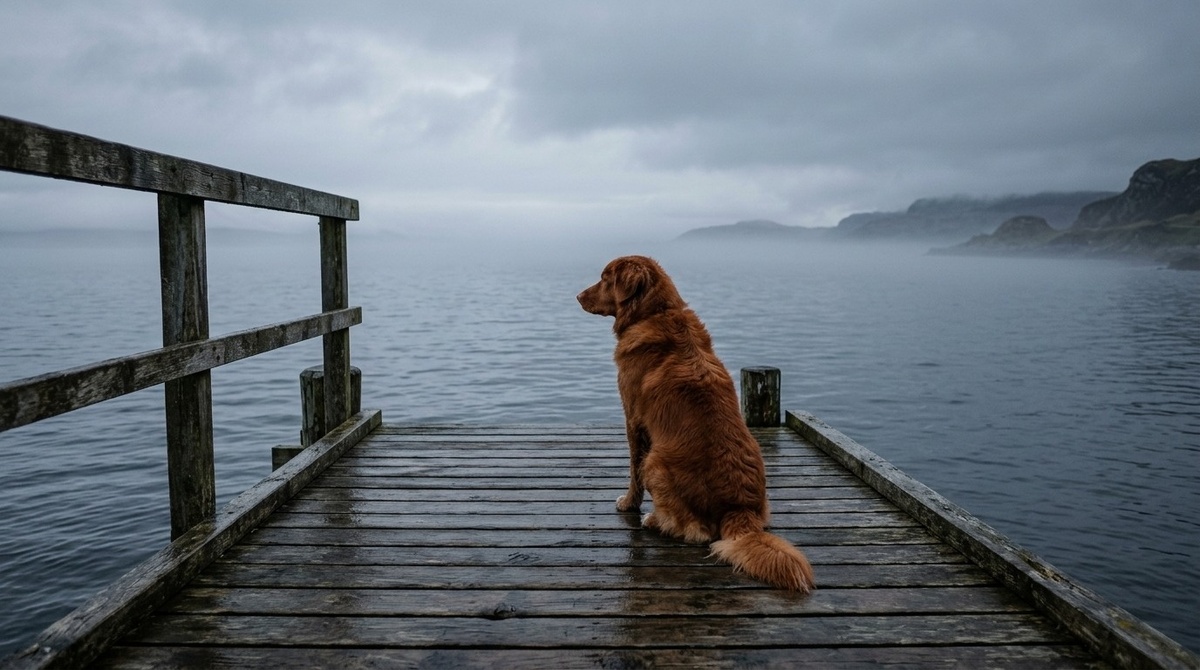 Она стояла у самого края досок и смотрела в сторону старого острова. Не двигалась. Уши чуть прижаты, хвост опущен – не поджат, а просто тихий. Я окликнул её. Она обернулась, посмотрела на меня – и снова повернулась к воде. Спокойно, без суеты. Как будто это была её работа – стоять здесь и смотреть туда.
