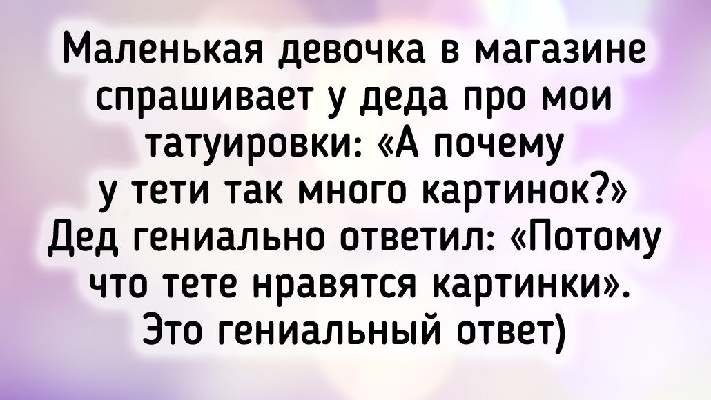 Многие люди годами не могут решиться на одну маленькую татуировку, а кто-то за год забивает рукав. Можно по-разному относиться к татуировкам, но нельзя отрицать, что это бесконечный источник забавных историй, которыми можно смешить друзей на посиделках. Занимаюсь испанским в группе, обсуждали недавно татуировки. Сказала, что у меня слова на спине набиты. Девочки заинтересовались, мол, что именно, а я сказала, что не хочу об этом говорить. А на самом деле, я тупо забыла. У меня на все плечо с заходом на лопатку — большое художественное тату, еще есть маленькие на запястье и на груди. Проходил медкомиссию в ведомственной поликлинике, надо было пройти дерматолога. Так получилось, что принимал заведующий отделением, дядечка лет 60. Думал, сейчас начнет мозги полоскать про тату. Но нет, осмотрел, рассмотрел подробно тату на плече и сказал: «Красиво, но я бы вам рекомендовал с тату меньше на солнце бывать или футболкой его закрывать». И поставил печать, что здоров. © Eqiulibr / Pikabu Малень