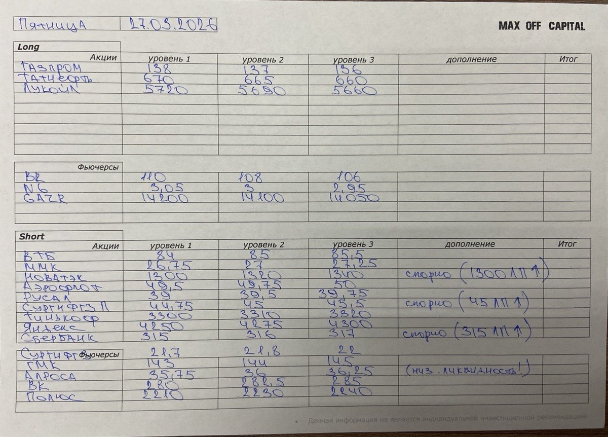 ✅ РЕКОМЕНДАЦИИ НА СЕГОДНЯ ➡️ Личный совет 👍 Сегодняшний день в PRO ▫️ Наши РЕСУРСЫ 😉 Стратегия ЗАДЁРГА 😉 Как пользоваться рекомендациями 😉 Как пользоваться ATR 😉 Видео моих сделок 😉 Куда ставить СТОП 😉 Дневник трейдера 😉 Как определить точку входа Уровни (часть 1) Уровни (часть 2) ТОЧКА ВХОДА Часть1 ТВХ Пробой ТВХ ЛП1Б (ложный пробой 1 баром) ТВХ ЛП2Б (ложный пробой 2 барами) ТВХ СЛП (сложный ложный пробой) ТВХ Отбой 1 баром ТВХ Отбой 2 барами ТВХ Дополнение Как рассчитать ATR Таблица рсчёта ATR Вероятности на рынке (часть1) Вероятности на рынке (часть2) Худшие дни для торговли на Бирже Зачем нужен индекс ММВБ Хватит делать эту ошибку Как работает крупный участник Что такое сильнее рынка Кто за кем ходит Как выбрать направление Где смотреть ИНДЕКСЫ и ТОВАРЫ 💬 Бесплатный | Чат - ПЕРЕЙТИ ❗️ Помним, что сегодня Пятница и многие спекулянты захотят зафиксировать свою прибыль ! #рекомендации