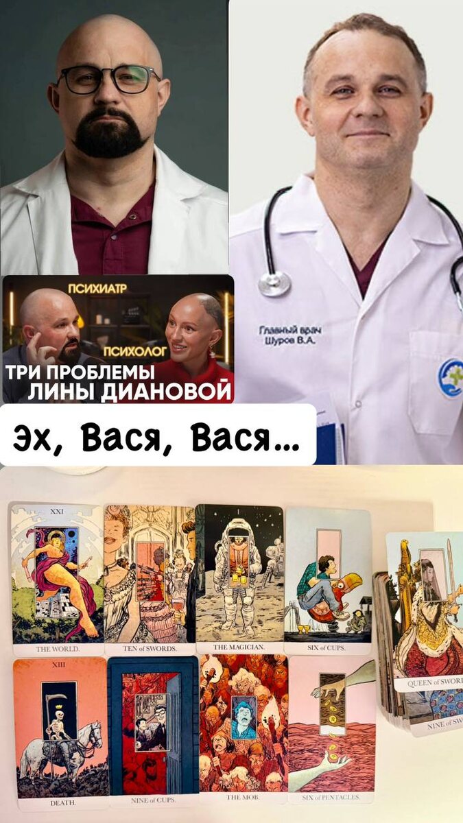 🤝 Вчера слушала разбор Тимофеевны про комплиментарное интервью Шурова с Линой диВановной, которую мы уже разбирали. Мое мнение: невозможно быть хорошим специалистом (особенно, психиатром или психологом), если ты все время пилишь контент. Кто перед нами? Мир — карта масштабных личностей, поэтому с амбициями у Васи все более чем хорошо, однако, аркан буквально «засасывает» людей в новую перспективную реальность. В данном случае, как только Шуров стал по-настоящему большим блогером, в полном смысле доктором он быть перестал (10 мечей). ➕Из плюсов: талантлив, невероятно харизматичен и очень хорош в ораторском деле (Маг), также умеет себя подать на публику, воздействовать своим авторитетом и умело манипулирует своей публикой. Но последнее, может быть и во вред, конечно. Многие short-сы его вызывают недоумение, а гости в интервью так вообще отвращение. Все ради хайпа православного, да прибудет с ним сила👌 ➖В минусах как раз его амбиции, растущие аппетиты в популяризации себя, самолюбовани