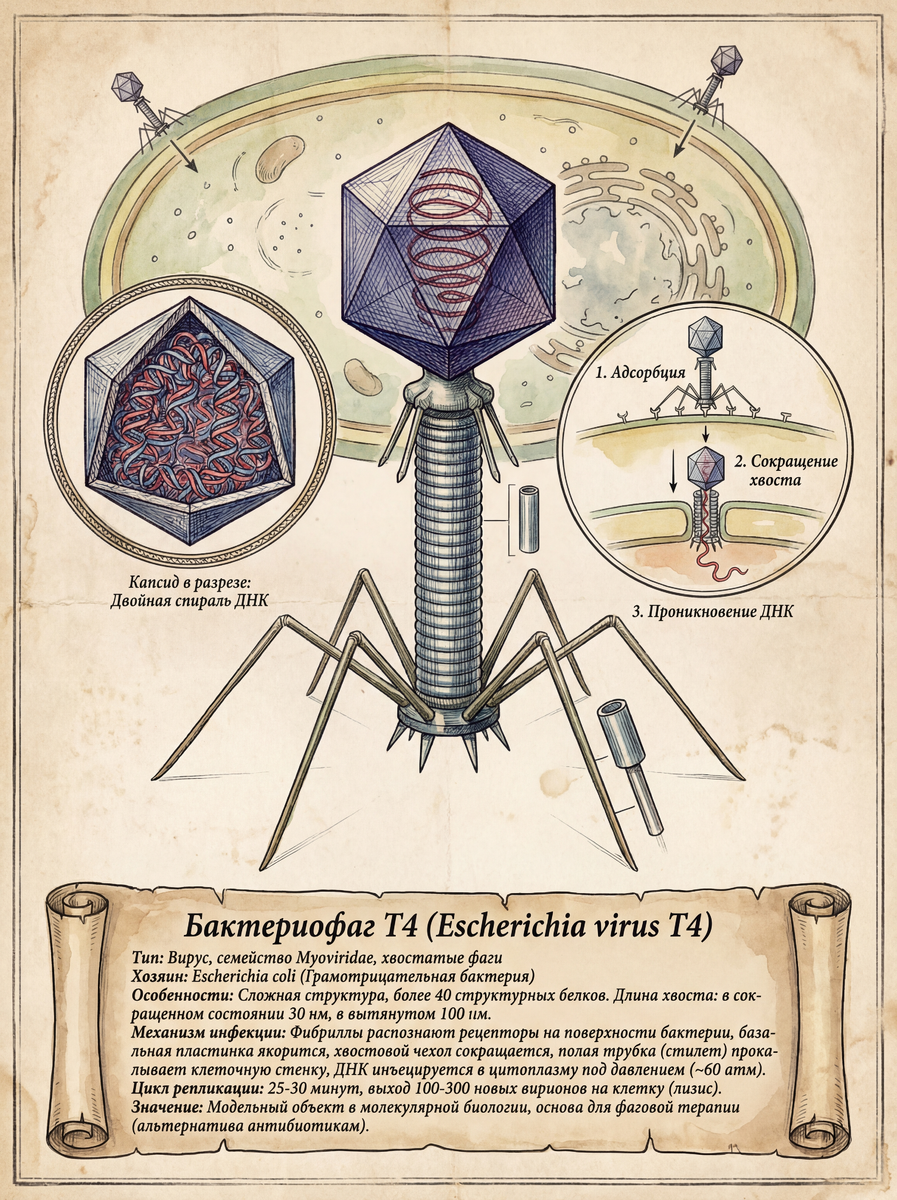 Бактериофаг T4 — вирус. Его нельзя назвать живым в полном смысле слова. У него нет обмена веществ, он не размножается сам, ему нужна клетка-хозяин. Но у него есть эволюция, есть адаптация, есть изощрённая стратегия выживания.
