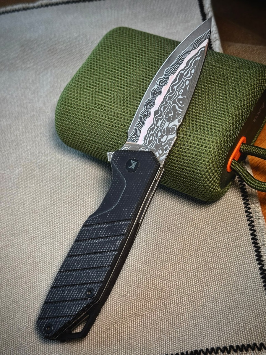 На клинке ламинат через медь с центром из стали VG-10, а на рукояти микарта.