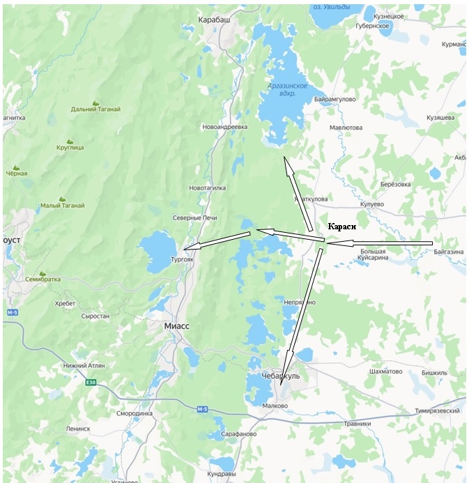 От Карасей были три пути: 1. На Чебаркуль (на юг, налево) 2. На Тургояк (на запад, прямо) 3. На Аргази, затем на Юрму (на север, направо).