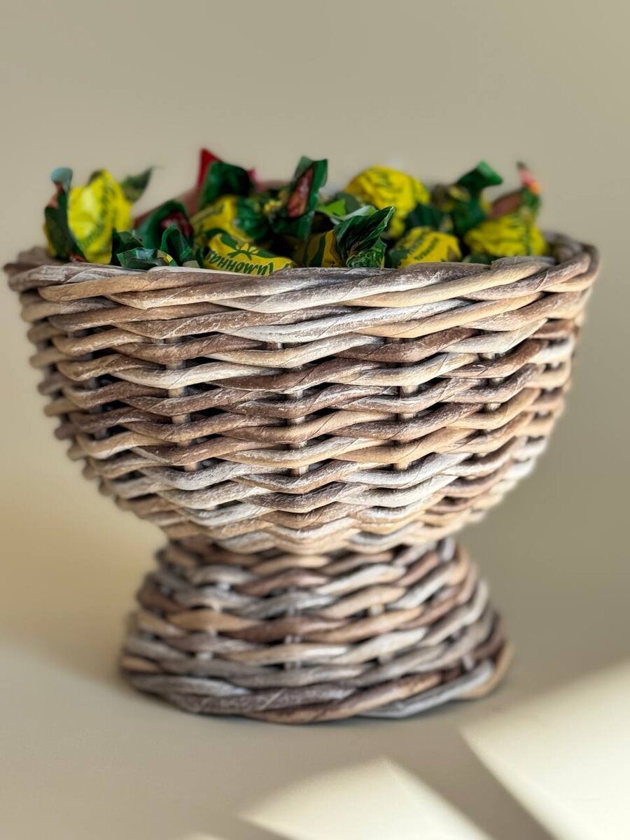 Для плетения конфетницы понадобятся две формы. Я использовала пиалы: одна побольше, другая поменьше. Трубочек ушло около 60 шт из полосы 10,5 х 50см. Если у вас трубочки длиной 30см, то приготовьте около 100 шт. Такую конфетницу мы плели в прямом эфире в ВК. Подробный процесс плетения смотрите по ссылкам. Это были прямые эфиры в ВК в двух частях. Конфетница Часть 1 Конфетница Часть 2 Эту корзиночку можно использовать не только как конфетницу, но и как кашпо для цветочных композиций