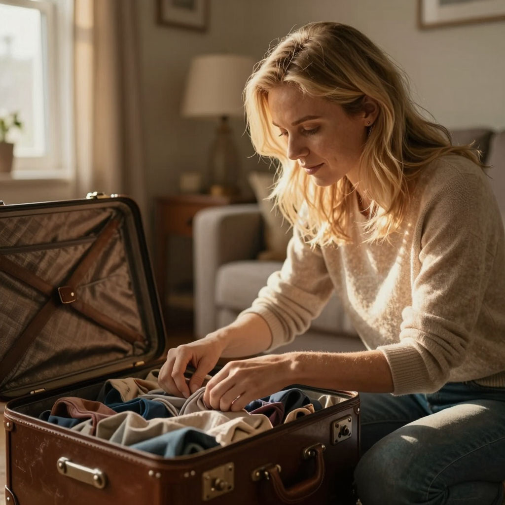 Дмитрий замер у дверного проёма, держа в руках чашку остывшего чая. Он смотрел, как Ольга аккуратно складывает платья в чемодан — так же аккуратно, как она годами складывала его рубашки после глажки.