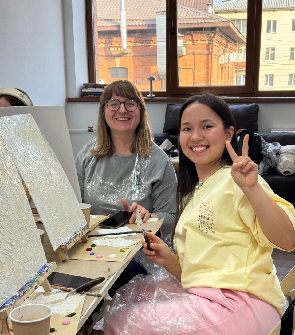 "Какой красивый вид из окна!" "Тут такие интересные акценты в интерьере" "Чай, кофе - у вас отличный сервис" "Загадать желание? Это мы любим" "Рисуем цветы, потому что весна!" "Очень приятная атмосфера, особенно хорошо, что мы все за одним столом" "Оказывается, рисовать это так увлекательно" "Прямо могу изобразить все, что хочу?!" "Как у всех классно получается..." "Мама, я нарисовала картину!" "Спасибо за вечер🧡"