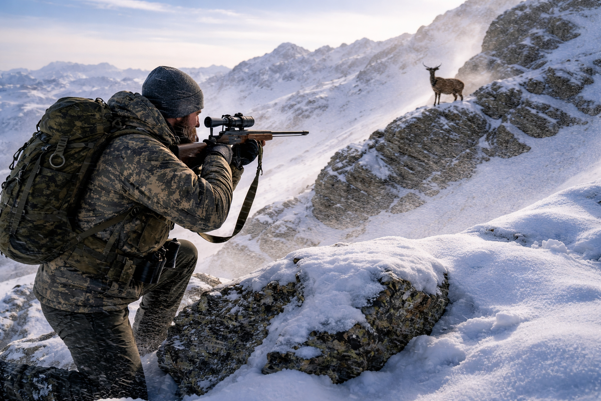 Артём начал подъём ещё в темноте, когда горы были чёрными силуэтами на фоне звёздного неба, а ветер уже тянул с перевала, срывая редкий наст и гоняя по склонам сухой снег, словно предупреждая — лёгкой дороги не будет. Он шёл без лишней спешки, но и без остановок, чувствуя, как под ногами меняется поверхность: то твёрдый наст держит, то вдруг проваливаешься по колено, и каждый такой шаг забирает силы, которые потом могут понадобиться в самый важный момент. Он знал эти места не первый год, но каждый раз гора встречала по-разному. Сегодня всё решал ветер. Он дул ровно, но порывами, меняя направление на короткие секунды, и это было хуже всего — такой ветер может выдать человека даже тогда, когда кажется, что всё просчитано. Артём постоянно проверял его — срывал щепку, бросал снег, смотрел, как он уходит в сторону, и только после этого делал следующий шаг. След он нашёл выше, почти у самого перевала. Узкий, уверенный, с характерной постановкой копыт — горный козёл шёл спокойно, не спеша, и