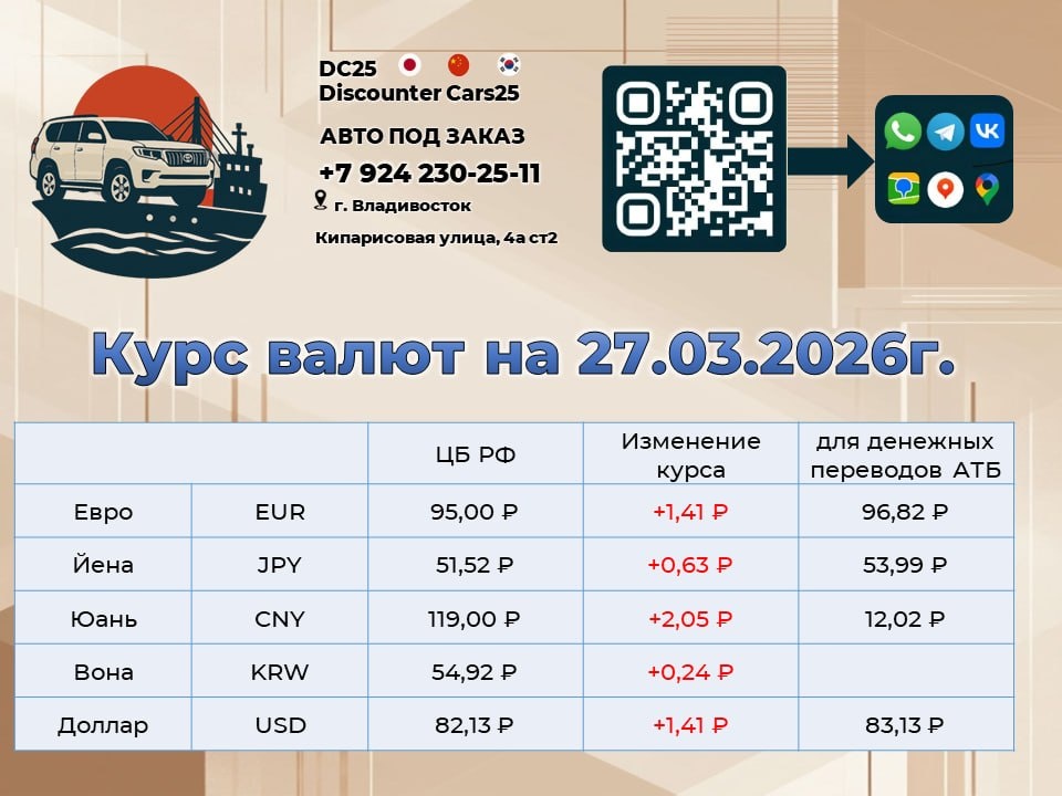 от Discounter Cars25🚗 Друзья! Если Вы рассматриваете автомобиль из Японии, Кореи или Китая, то ключ к выгодной сделке — в актуальных курсах. Наши автомобили, которые можно приобрести по фиксированной цене ТУТ➡️ DROM.RU‼️ Каждая валюта влияет на Вашу будущую машину: 💸 Евро — пошлина рассчитывается исходя из курса Евро в день таможенного оформления. 💴 Йена — определяет цену авто в Японии. 🇨🇳Юань — курс для покупки в Китае. 🇰🇷 Вона — основа для сделок в Корее. 💵 Доллар (санкционный) — для расчета авто с объемом двигателя от V-1.9. Именно эти цифры позволяют нам просчитать конечную стоимость «под ключ» без скрытых сюрпризов. Хотите себе автомобиль из Японии, Кореи или Китая? Для консультации и расчета, напишите или позвоните нашим специалистам: 📞 +79242302511 ✍️ Написать в What's App 🌐 Наш сайт ‼️ Мы в МАХ ✔️ Мы на Drom.ru 🚗 📱 Мы в ВК ✔️ Мы в Дзен ‼️Удачного дня‼️ DC25 Discounter Car's25. АВТО под ЗАКАЗ 🇯🇵🇰🇷🇨🇳 г. Владивосток ул. Кипарисовая 4-А ст2. Удачного дн