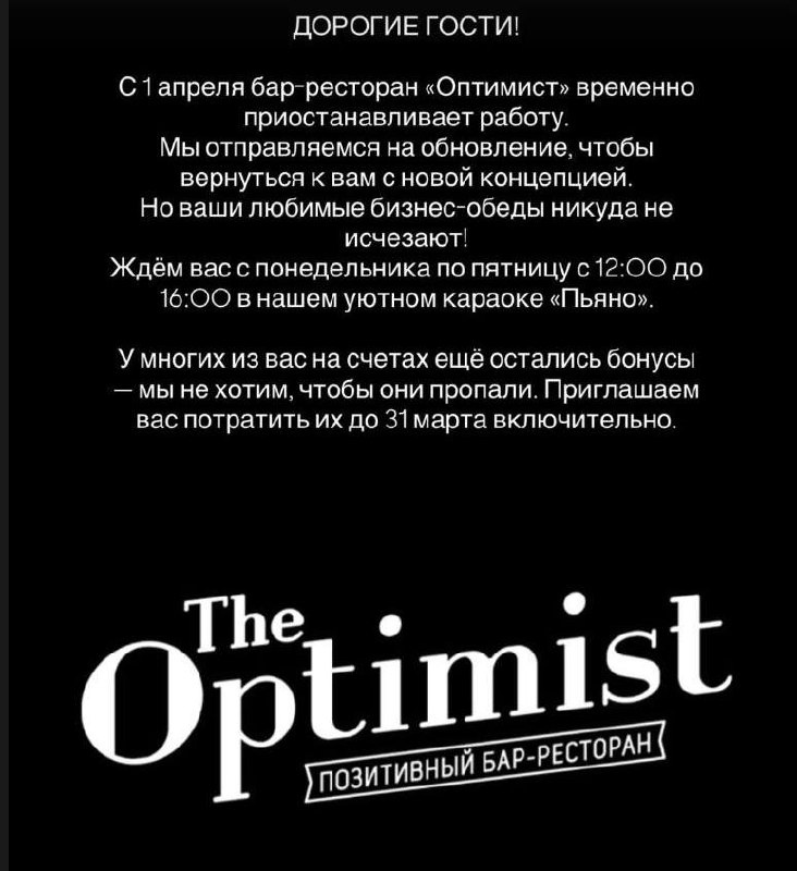 ». Он проработал больше 10 лет. В официальном заявлении команда не называет причин закрытия и говорит, что якобы закрываются на реконструкцию. Бар на Ленина 50б открыли в 2015 году сербские рестораторы, во главе с Ненадом Живковичем. Затем они сконцентрировались на открытии нового своего проекта «Дориан Грей». Говорят, что заведением сейчас управляет собственник помещения БЦ «Континент», в здании которого и находится бар. @Квартал Миллионеров
