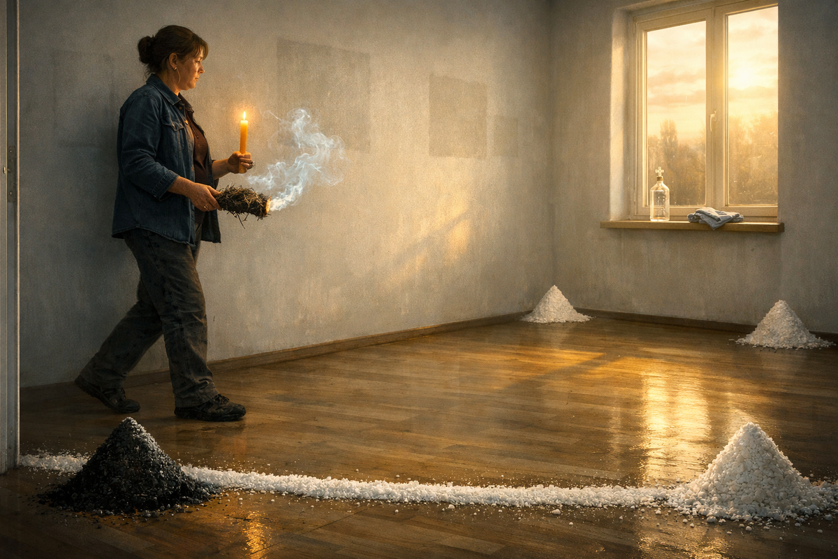 Через три дня я собрала соль из углов. Мама велела — веником на совок и в пакет, не руками. Соль из дальней комнаты была нормальная — белая, сухая. Из кухни — желтоватая. Из ванной — серая. С порога — почти чёрная.