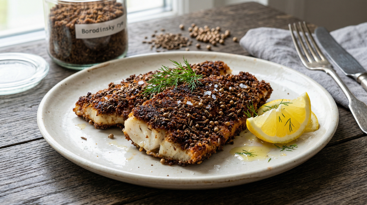 Бородинский хлеб — это не просто ржаной хлеб. Это хлеб с характером. В его составе есть кориандр и тмин, причём не просто в виде посыпки сверху, а в самом тесте. Когда вы делаете из него сухари и потом обжариваете рыбу, эти специи раскрываются под воздействием температуры и начинают звучать по-новому. Тмин даёт тёплый, чуть сладковатый аромат с лёгкой горчинкой. Кориандр добавляет цитрусовую свежесть. И всё это ложится на рыбу так органично, будто именно для неё и было задумано.