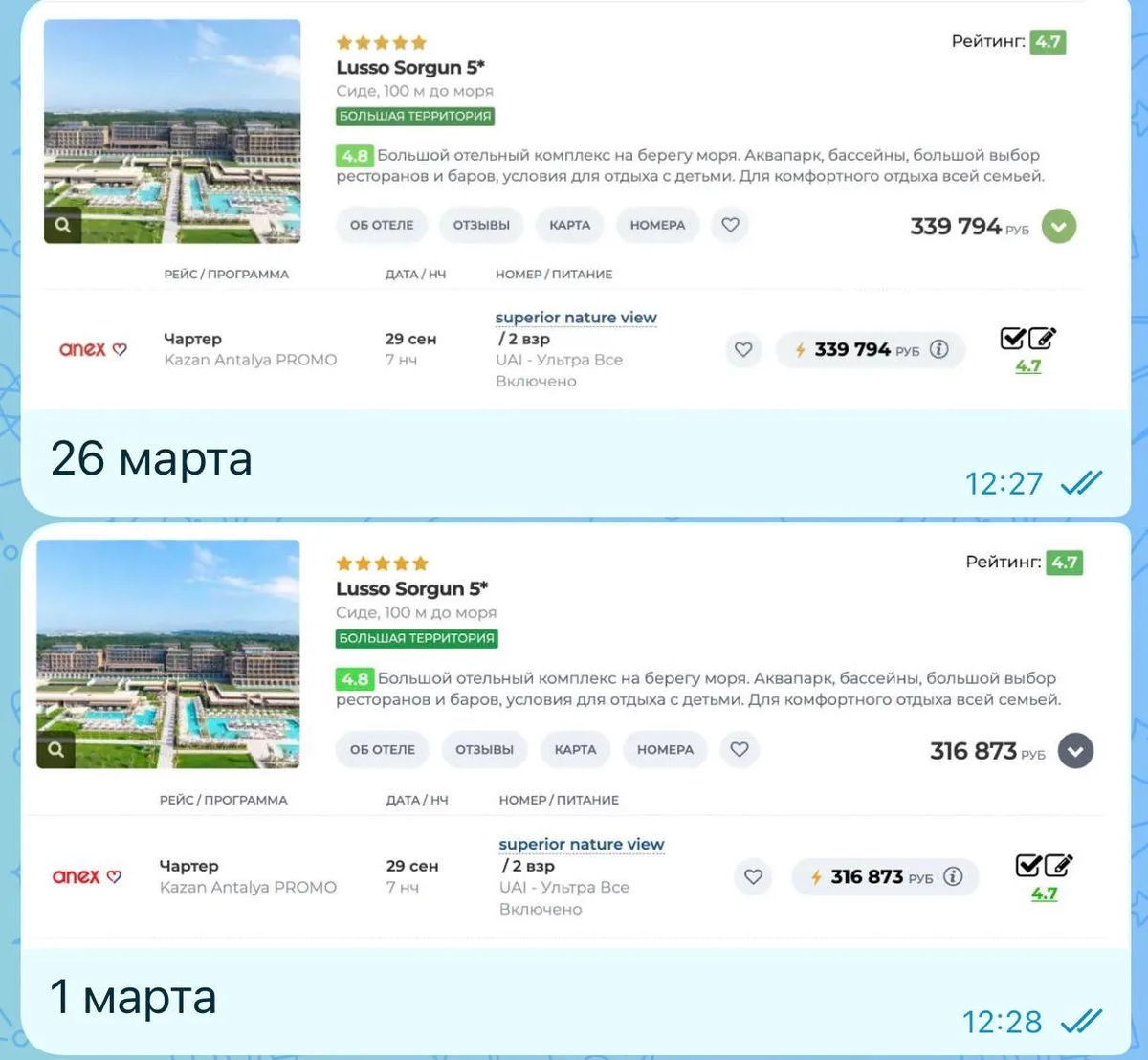 Друзья, вот свежие примеры, чтобы вы понимали — откладывать покупку тура может дорого обойтись. Турция Lusso Sorgun Rixos Premium Tekirova The Land Of Legends Free Access 5* Вывод простой: если нашли подходящий вариант — не тяните, бронируйте сразу. ❗ Важно: это мы смотрели туры с вылетом из Казани. Как правило, из такого города билеты быстро заканчиваются, потому что оттуда вылетают туристы не только из Казани, но и из ближайших городов — Набережные Челны, Нижнекамск, Елабуга, Альметьевск, даже иногда и Саратов, Самара и другие. Тур быстро раскупают, и ждать вас никто не будет! Имейте в виду: мы бронируем туры не только из Москвы, но и из любых городов, где есть аэропорт. Так что если хотите поймать хороший вариант — не откладывайте бронирование. Турагенство ХеленТур