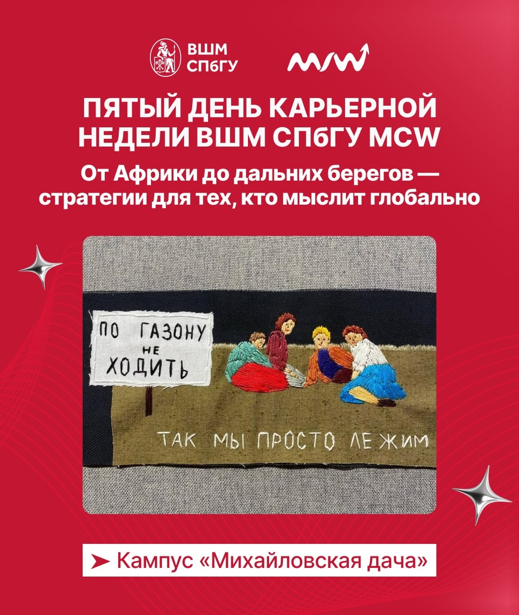 ! Так мы просто лежим!» – вышивка выпускника ВШМ СПбГУ Александра Браулова заряжена на отличное настроение и точно приближает время зеленых газонов😉! Ну а ходить на мероприятия Карьерной недели MCW не просто можно, но и очень интересно! Отличной пятницы, друзья! Вот, что нас ждет сегодня: 📌 Разбираем выход на международные рынки, создание вневременных брендов и карьерные траектории за пределами России. Ждём вас на следующих ивентах: — 12:00 – 13:30 | ауд. 1207 Africa 2.0: Strategies for Russian Business in Third World Markets (Африка 2.0: стратегии для российского бизнеса на рынках третьего мира) Как российскому бизнесу осваивать рынки Африки и других развивающихся стран? Разговор о новых точках роста, локальной специфике, вызовах и возможностях, которые открываются перед компаниями, готовыми действовать за пределами привычной географии. — 14:00 – 15:30 | ауд. 2222 Beyond season: создание модного бренда без срока годности (Вне сезона: создание модного бренда без срока годности)