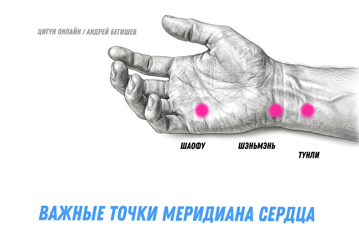 Глубже, чем Шэньмэнь. Давите уверенно, с ощущением распирания. Круговые движения или пульсация. 1-2 минуты на каждой руке. Можно сочетать с Шэньмэнь — они работают в паре.